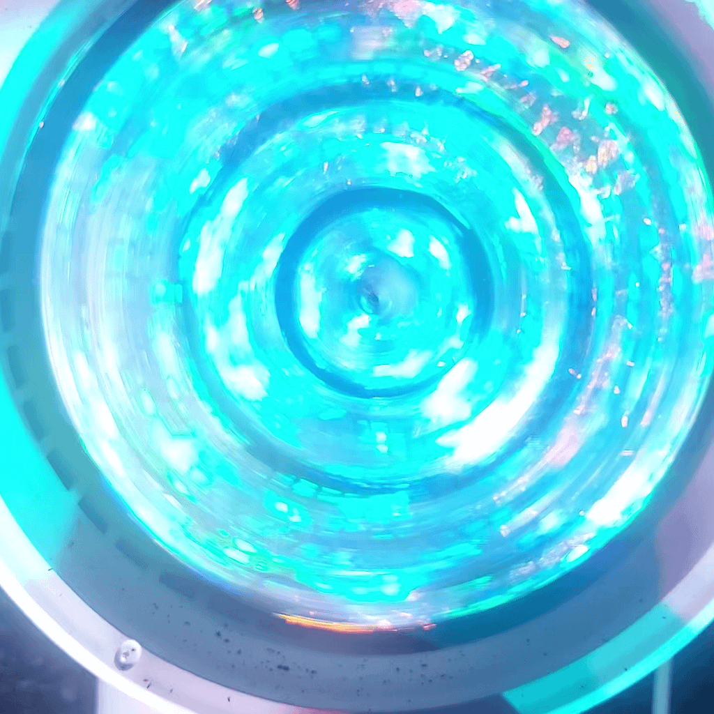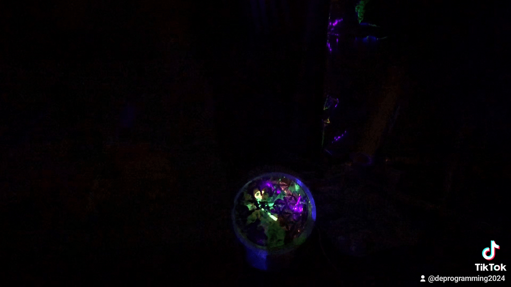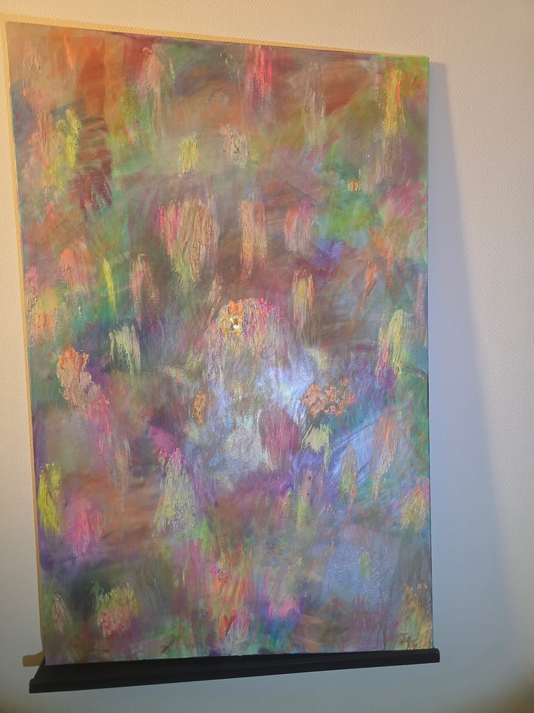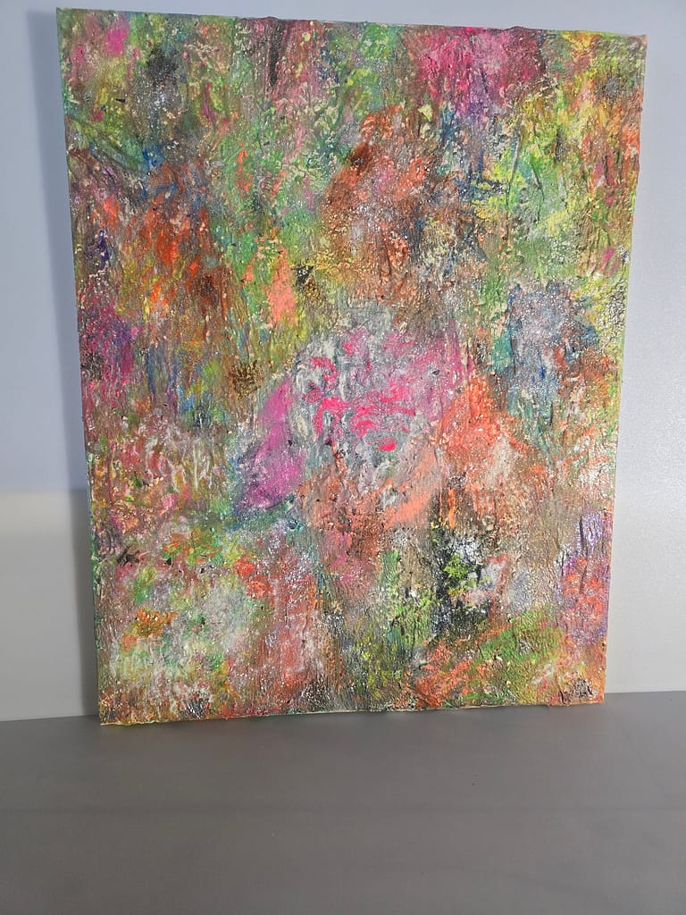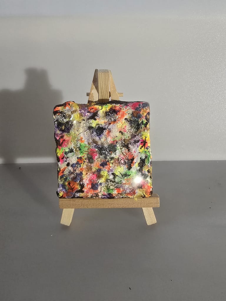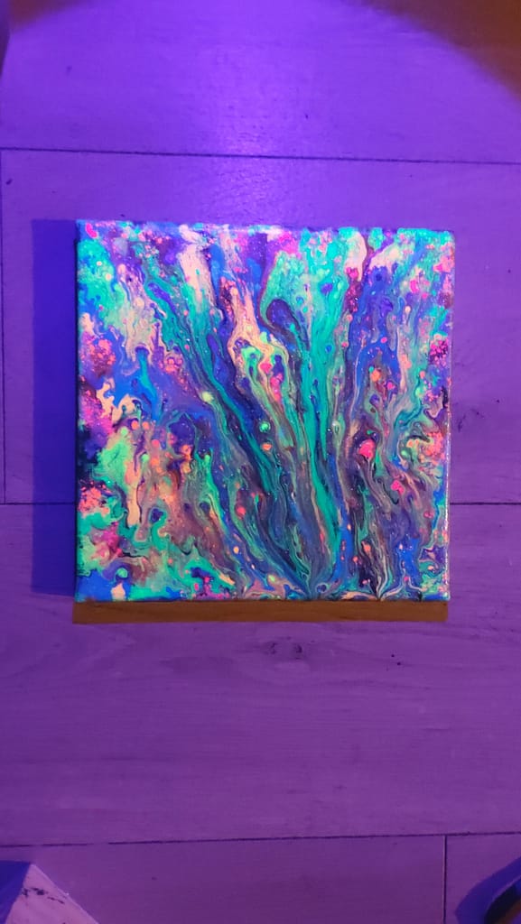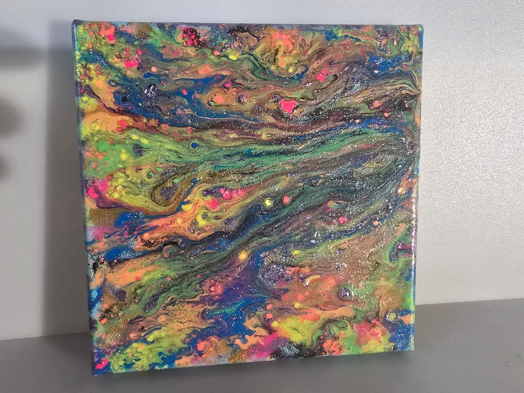 “Anti psychotic masterpiece” 20cm x 20cm, Acrylic paint, Pouring medium, Glow in the dark paint, Flourescent paint, Holographic glitter. 2024