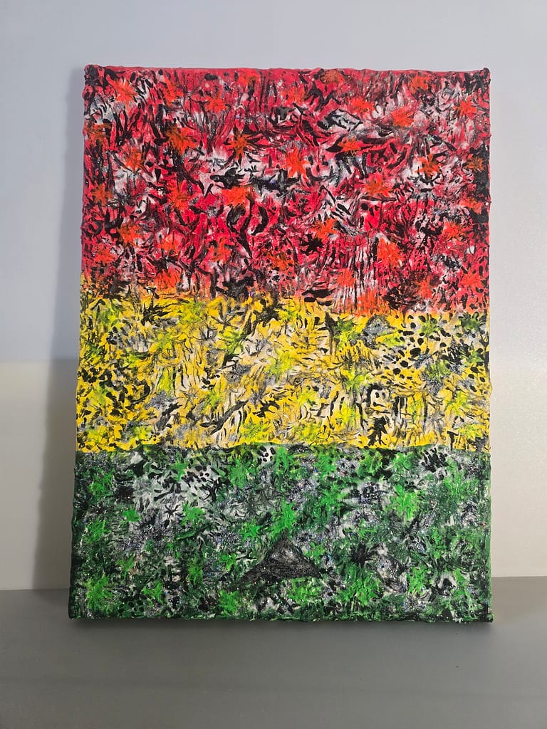 “Dubbed” 30cm x 40 cm, Acrylic paint, Vanta Black alternative paint, Glow in the dark paint, Flourescent paint, Holographic glitter, Glass glitter, Texture paste. 2023